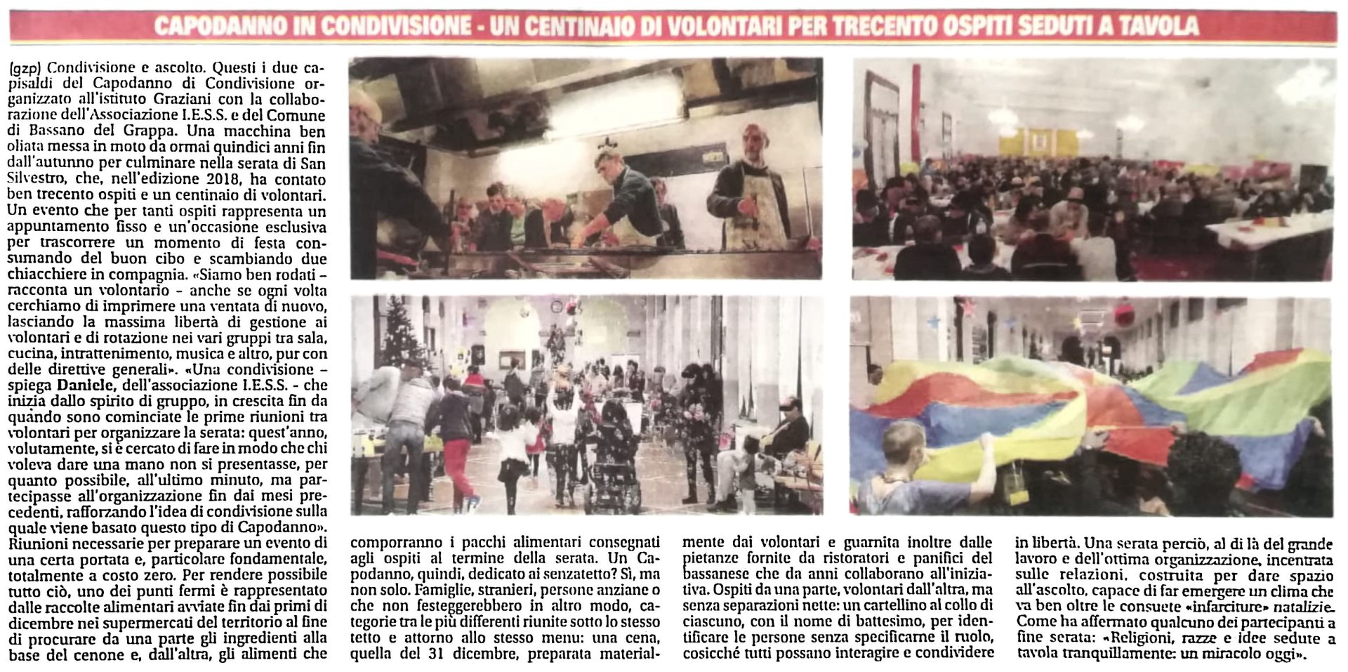 Condivisione e ascolto. Questi i due capisaldi del Capodanno di Condivisione organizzato all’istituto Graziani con la collaborazione dell’Associazione I. E. S. S. e del Comune di Bassano del Grappa. Una macchina ben oliata messa in moto da ormai quindici anni fin dall’autunno per culminare nella serata di San Silvestro, che, nell’edizione 2018, ha contato ben trecento ospiti e un centinaio di volontari. Un evento che per tanti ospiti rappresenta un appuntamento fisso e un’occasione esclusiva per trascorrere un momento di festa consumando del buon cibo e scambiando due chiacchiere in compagnia. «Siamo ben rodati - racconta un volontario - anche se ogni volta cerchiamo di imprimere una ventata di nuovo, lasciando la massima libertà di gestione ai volontari e di rotazione nei vari gruppi tra sala, cucina, intrattenimento, musica e altro, pur con delle direttive generali». «Una condivisione - spiega Daniele, dell’associazione I.E.S.S. - che inizia dallo spirito di gruppo, in crescita fin da quando sono cominciate le prime riunioni tra volontari per organizzare la serata: quest’anno, volutamente, si e cercato di fare in modo che chi voleva dare una mano non si presentasse, per quanto possibile, all’ultimo minuto, ma partecipasse all’organizzazione fin dai mesi precedenti, rafforzando l’idea di condivisione sulla quale viene basato questo tipo di Capodanno». Riunioni necessarie per preparare un evento di una certa portata e, particolare fondamentale, totalmente a costo zero. Per rendere possibile tutto ciò. uno dei punti fermi è rappresentato dalle raccolte alimentari avviate fin dai primi di dicembre nei supermercati del territorio al fine di procurare da una parte gli ingredienti alla base del cenone e, dall’altra, gli alimenti che comporranno i pacchi alimentari consegnati agli ospiti al termine della serata. Un Capodanno, quindi, dedicato ai senzatetto? Sì, ma non solo. Famiglie, stranieri, persone anziane o che non festeggerebbero in altro modo, categorie tra le più differenti riunite sotto lo stesso tetto e attorno allo stesso menu: una cena, quella del 31 dicembre, preparata materialmente dai volontari e guarnita inoltre dalle pietanze fornite da ristoratori e panifici del bassanese che da anni collaborano all’iniziativa. Ospiti da una parte, volontari dall’altra, ma senza separazioni nette: un cartellino al collo di ciascuno, con il nome di battesimo, per identificare le persone senza specificarne il ruolo, cosicché tutti possano interagire e condividere in libertà. Una serata perciò, al di là del grande lavoro e dell’ottima organizzazione, incentrata sulle relazioni, costruita per dare spazio all’ascolto, capace di far emergere un clima che va ben oltre le consuete «infarciture» natalizie. Come ha affermato qualcuno dei partecipanti a fine serata: «Religioni, razze e idee sedute a tavola tranquillamente: un miracolo oggi».