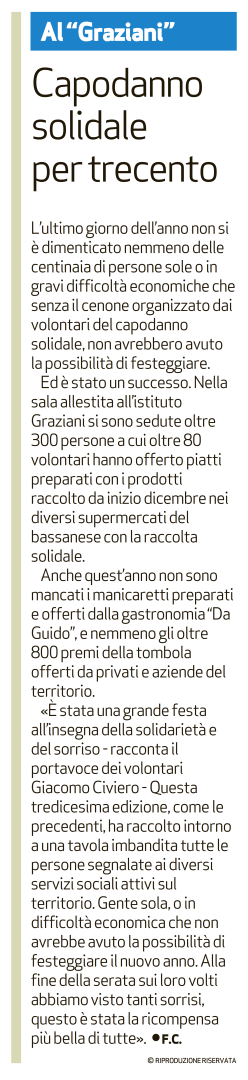 «È stata una grande festa all’insegna della solidarietà e del sorriso - racconta il portavoce dei volontari Giacomo Civiero - Questa tredicesima edizione, come le precedenti, ha raccolto intorno a una tavola imbandita tutte le persone segnalate ai diversi servizi sociali attivi sul territorio. Gente sola, o in difficoltà economica che non avrebbe avuto la possibilità di festeggiare il nuovo anno. Alla fine della serata sui loro volti abbiamo visto tanti sorrisi, questo è stata la ricompensa più bella di tutte».